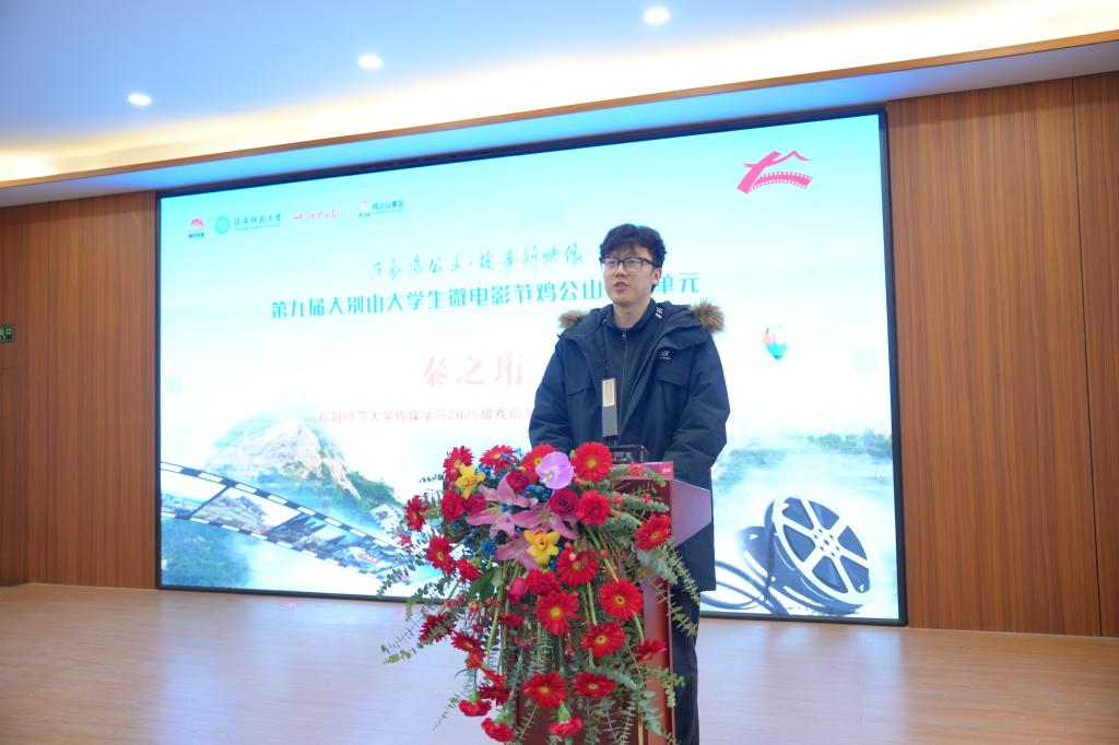 williamhill中国2025级戏剧与影视专业研究生秦之珩作为学生代表发言,表达了参赛学子深耕创作、用心诠释鸡公山文化魅力的决心,承诺将以严谨的创作态度和饱满的创作热情,深入采风、精心打磨作品,力求用优秀的影像成果展现专业素养,不负各方期待。