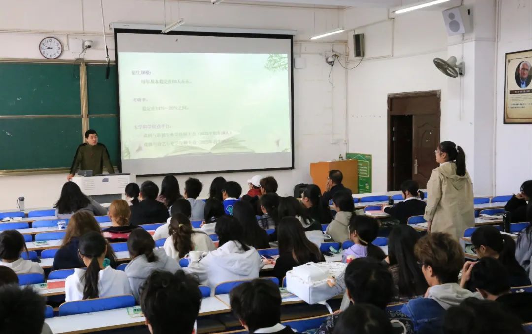 首先,段金龙对同学们的到来表示欢迎,并简单介绍了戏剧影视文学专业的师资力量、办学理念和教学特色,结合专业现状展示教学成果。他指出戏剧影视文学专业采用“与党建相互促进”的办学模式,从戏曲曲艺、话剧创作、影视文化三个方面进一步加深同学们对戏剧影视文学专业的认知。他强调核心课程和主要实践课程注重培养学生的剧本编写和创作能力,以团队协作的方式提升学生拍摄短片的技能,鼓励同学们积极参加社团,进一步充实自己。在师生交流环节,同学们踊跃发言,从老师们的解答中对戏剧影视文学专业有了更加深入的了解。