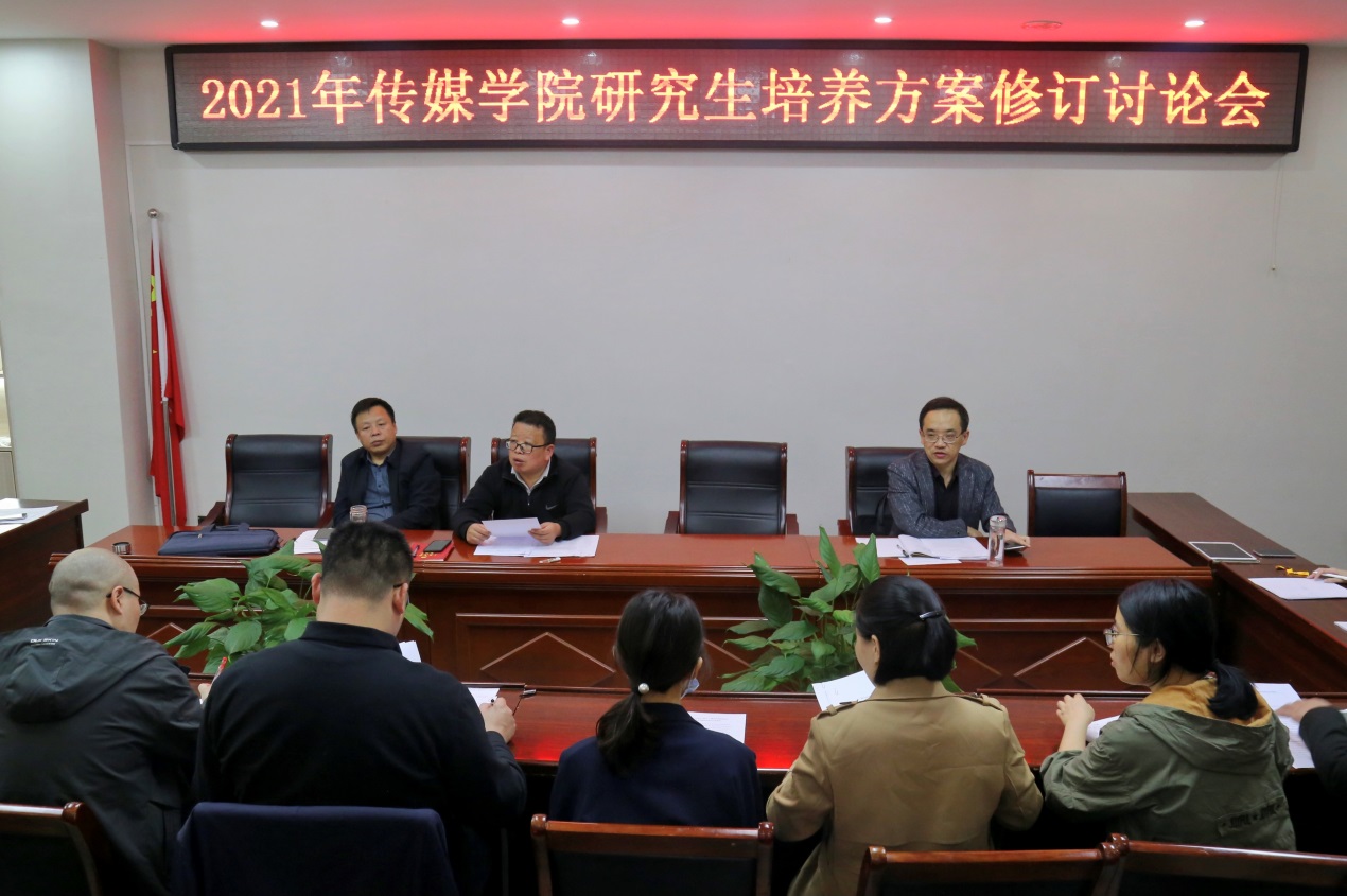 会上,副院长周强首先传达了由国务院学位委员会办公室出版的《专业学位研究生核心课程指南(试行)》中对艺术硕士(广播电视领域)专业学位研究生的具体培养要求,为在座领导、老师详细介绍了2021年我院研究生培养方案的修订背景、依据与要求,并依次提出当前亟待解决的培养方案修订、学分认定以及课程安排等问题。