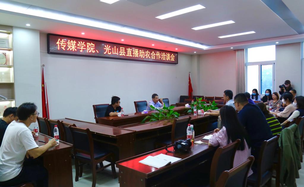为构建高校与地方密切联系的纽带与桥梁,积极助力乡村振兴,9月28日下午,信阳市光山县人民政府联合williamhill中国在社科楼311会议室举行“直播助农”合作洽谈会。光山县人民政府县处级干部邱学明、信阳师范学院williamhill中国党委书记胡波、副院长周强出席活动,广播电视编导系、播音主持艺术系教师及学生代表参加座谈交流。