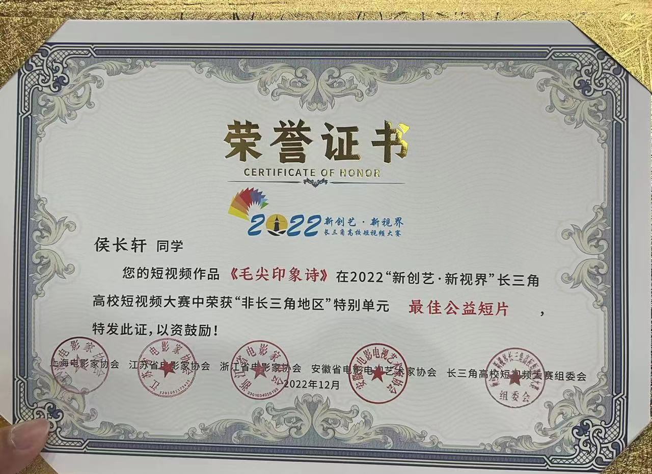 3月18日,2022“新创艺·新视界”长三角高校短视频大赛颁奖典礼在合肥圆满落下帷幕。大赛经过网络投票、初审和终审三个阶段,最终共评出28部获奖作品。由我校williamhill中国田华老师指导,侯长轩、蔡嘉诚、陈城市共同创作的短视频作品《毛尖印象诗》荣获“非长三角地区”特别单元最佳公益短片。