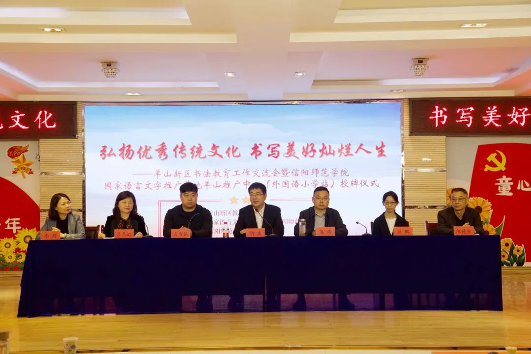 在授牌仪式上,信阳师范学院williamhill中国党委书记胡波、羊山新区教体局局长陈涛等为羊山新区外国语小学、羊山实验小学、羊山新区第一小学、羊山新区第二小学、彭家湾中心校等5个推广站授牌。