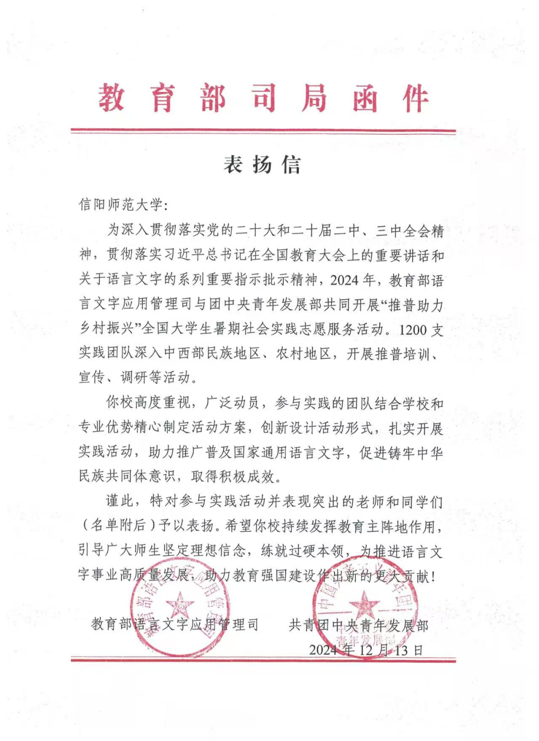 教育部和团中央给我校发来表扬信!