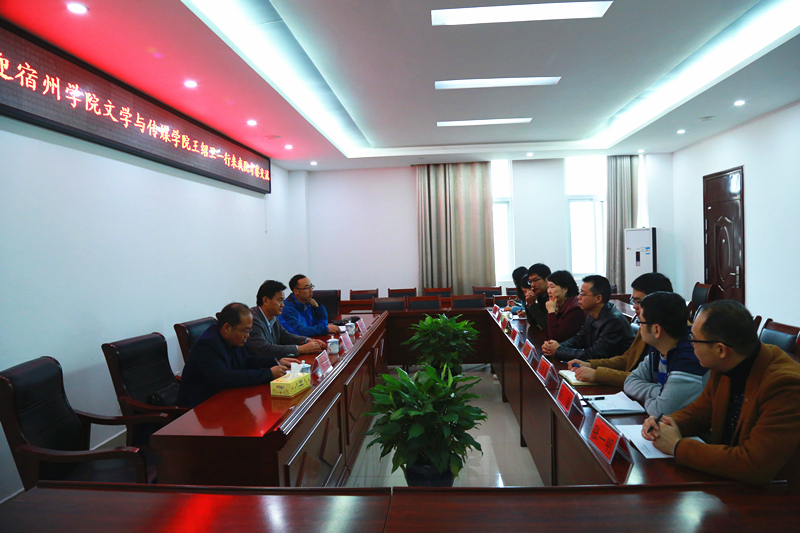 10月16日上午,宿州学院文学与williamhill中国党总支副书记王绍卫、教学科研秘书王磊及教研室主任朱曙辉一行来我院考察交流。座谈会在社科楼311会议室召开,党委书记王振海、院长焦素娥、党委副书记胡波等领导老师参加了座谈,会议由胡波主持。