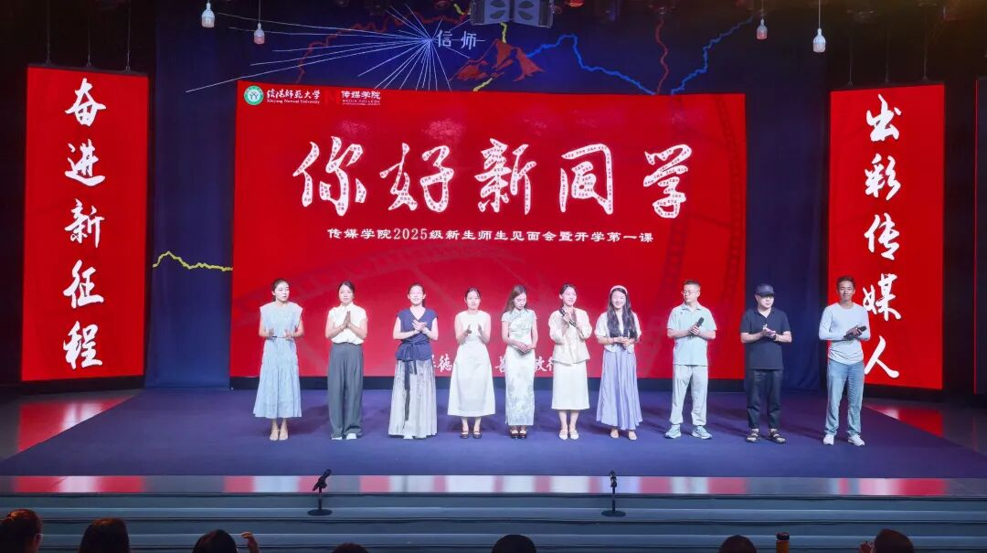 师生见面会环节,播音主持系、广播电视系、戏剧影视系、动画系、教学办公室老师、辅导员、领导班子成员依次上台给新生送上入学寄语。