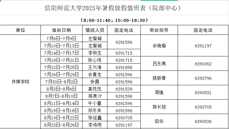 按照校历安排,7月5日教职工开始轮休,8月27日教职工报到,假期值班安排如下: