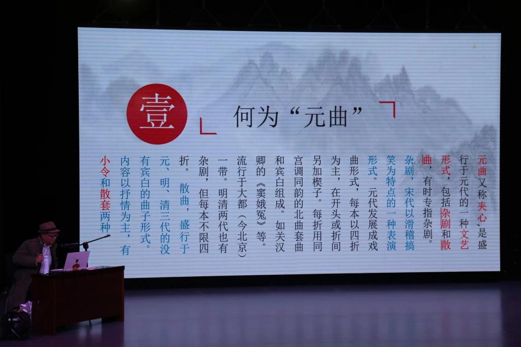讲座伊始由张大新老师致辞,表示对秦华生老师的热烈欢迎。此次讲座,秦华生老师主要从“何为元曲”、“元曲四大家名称来历”和“人物简介及作品分析”三个主要方面展开论述。秦华生表示,元曲包括杂剧和散曲两部分,散曲有小令和散套两种形式。他以马致远的《天净沙·秋思》为例,分析小令的空景概括,以散曲套散曲,介绍人与时间、空间的关系。接着,他从元朝立国到灭南宋、元世祖至元年间到元顺帝后至元年间、元成宗至正年间到元末三个时期出发,介绍元曲的发展历程,分析各个时期的代表性元曲剧作家。